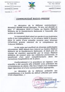 L’homme politique Anicet Georges Ekane a rendu l’âme ce lundi 1er décembre 2025, de suite de maladie. Celui qui a été président du Manidem suivait ses soins malgré sa garde-à-vue judiciaire. Le ministère en charge de la Défense vient de rendre public un communiqué.