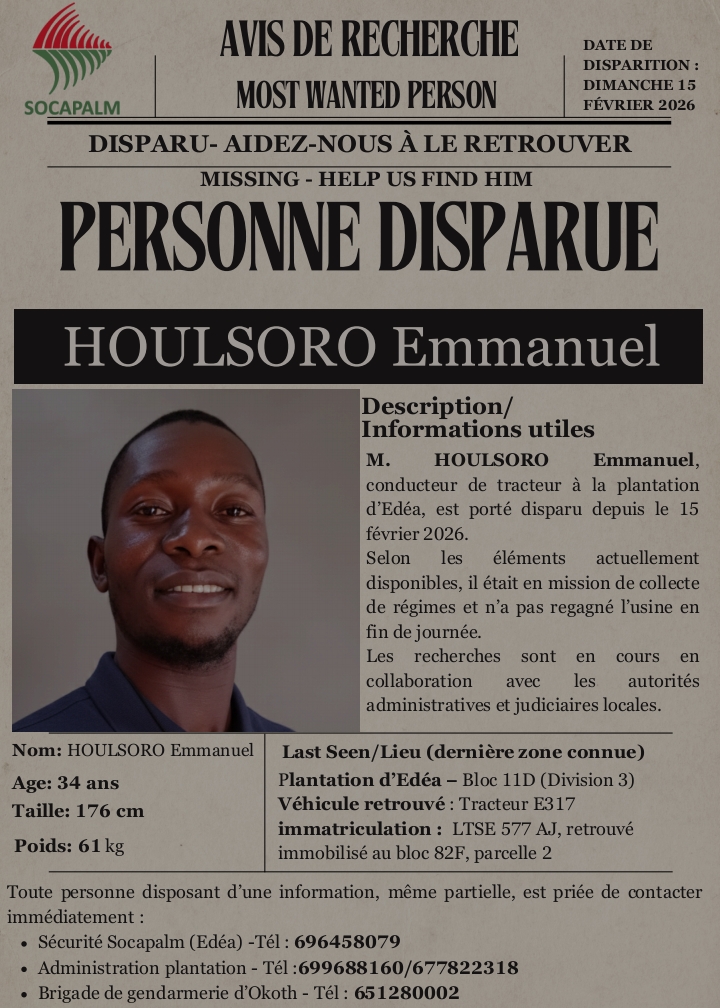 AccueilA La UneAvis de recherche : la Socapalm annonce la disparition de Houlsoro Emmanuel A La UneÉconomie 17 février 2026 Mis à jour il y'a : 17 février 2026 Avis de recherche : la Socapalm annonce la disparition de Houlsoro Emmanuel Par LA VOIX DU KOAT Partager FacebookTwitterPinterestWhatsApp - Advertisement - La Socapalm communique sur la disparition de N M. HOULSORO Emmanuel, conducteur de tracteur à la plantation d’Edéa, survenue le dimanche 15 février 2026. - Advertisement - Tags#AvisDeRechercheSocapalm Partager FacebookTwitterPinterestWhatsApp LA VOIX DU KOAThttps://lavoixdukoat.com - Advertisement - Restez Connectés 16,985FansJ'aime2,458SuiveursSuivre61,453AbonnésS'abonner Coup De Cœur A Vous Le vrai visage du Vatican : le cardinal Fernandez ou l’agenda lgbtq+ à l’assaut du dogme LA VOIX DU KOAT - 15 février 2026 - Advertisement - A La Une SONOLIVEFEST 2026 – Tchakala VIP se déshabille devant des mineurs au Parcours Vita 17 février 2026 A La Une Patou Mangamba : «Djudju Fever marque une étape fondatrice dans ma carrière » 16 février 2026 Culture Réflexion : les industries culturelles camerounaises en quête de structuration 16 février 2026 LAISSEZ UNE REPONSE Annuler une réponse Commenter S'il vous plaît entrez votre commentaire! Nom :* S'il vous plaît entrez votre nom ici Email :* Vous avez entré une adresse email incorrecte! Veuillez entrer votre adresse email ici Site : Enregistrer mon nom, email et site web dans ce navigateur pour la prochaine fois que je commenterai. Articles Similaires A La Une Infanticide à Nkolbisson : au nom de la vengeance, elle tue ses trois enfants et se donne la mort 17 février 2026 A La Une SONOLIVEFEST 2026 – Tchakala VIP se déshabille devant des mineurs au Parcours Vita 17 février 2026 A La Une Patou Mangamba : «Djudju Fever marque une étape fondatrice dans ma carrière » 16 février 2026 Culture Réflexion : les industries culturelles camerounaises en quête de structuration 16 février 2026 A Vous Le vrai visage du Vatican : le cardinal Fernandez ou l’agenda lgbtq+ à l’assaut du dogme 15 février 2026 - Advertisement -