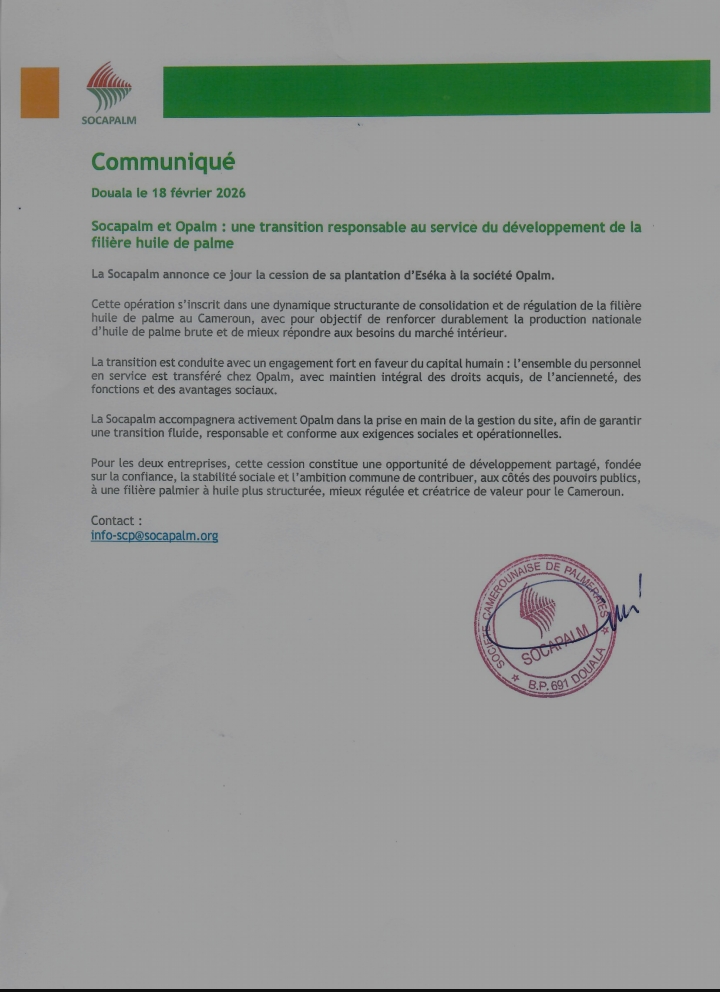 Le communiqué est tombé ce mercredi 18 février 2026. La Société camerounaise de Palmeraies Socapalm, cède sa plantation d’Eséka à la société Opalm.