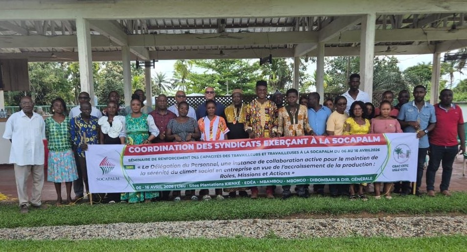 La salle de réunion de la plantation de Socapalm à Kienké dans l’Océan a servi de cadre ce lundi 6 avril 2026 au Séminaire de renforcement des capacités syndicales des délégués du personnel de la Société camerounaise de palmeraies, Socapalm. Plus d’une quarantaine de personnes ont pris part à cette initiative de la Coordination des syndicats exerçant à la Socapalm, qui a eu pour fil conducteur : « La délégation du personnel, une instance de collaboration active pour le maintien de la sérénité du climat social en entreprise en vue de l’accroissement de la production : Rôles, missions et actions ». Cette session intensive de formation itinérante à l’attention des délégués du personnel et des représentants syndicaux de la Socapalm est un programme ambitieux qui vise à professionnaliser le dialogue social au sein de l’entreprise.
