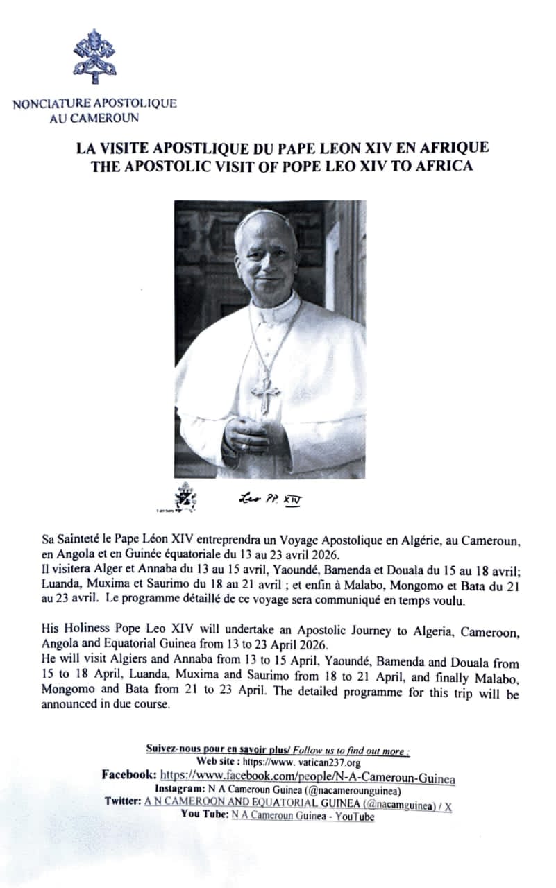 Le Pape Léon IV effectuera une visite apostolique au Cameroun du 15 au 18 avril 2026. L’annonce a été faite à travers un communiqué de presse signé par le ministre, directeur du cabinet civil à la présidence de la République, Samuel Mvondo Ayolo.